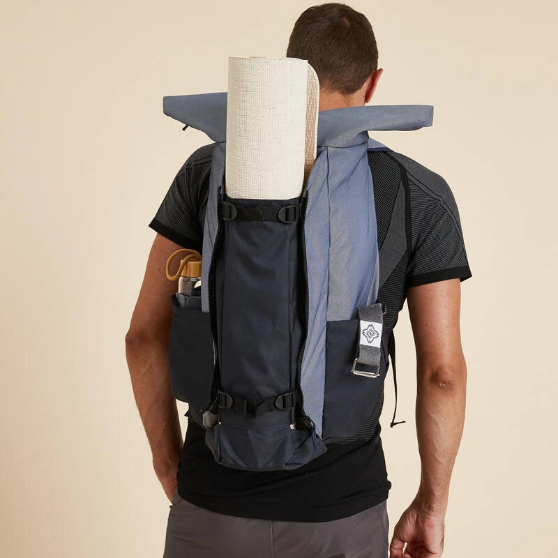 Compra en Decathlon Mochila Esterilla Yoga Azul Gris Nuestros diseñadores yoguis han concebido esta mochila modular muy urbana, para transportar todo el equipo de yoga y el ordenador. Volumen 35 L.